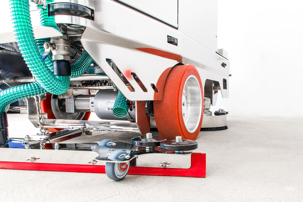 Der Saugfuß schwenkt in dezenten Drehbewegungen um Hindernisse herum. Spurgeführte Stützrollen zwingen den Saugfuß zu einer unmittelbaren Rückführung in die stabile Ausgangslage. Durch die Anordnung der Antriebsachse und des V-förmigen Bürstenkopfes konnte der Saugfuß geschützt unter dem Chassisende des Fahrzeugs positioniert werden. Dieses Kriterium gewinnt bei Rückwärtsfahrten mit schlechter Einsicht an Bedeutung, da die hinteren Gummipuffer am Fahrgestell einen möglichen Aufprall abfedern und der Saugfuß davon in keiner Weise betroffen ist.