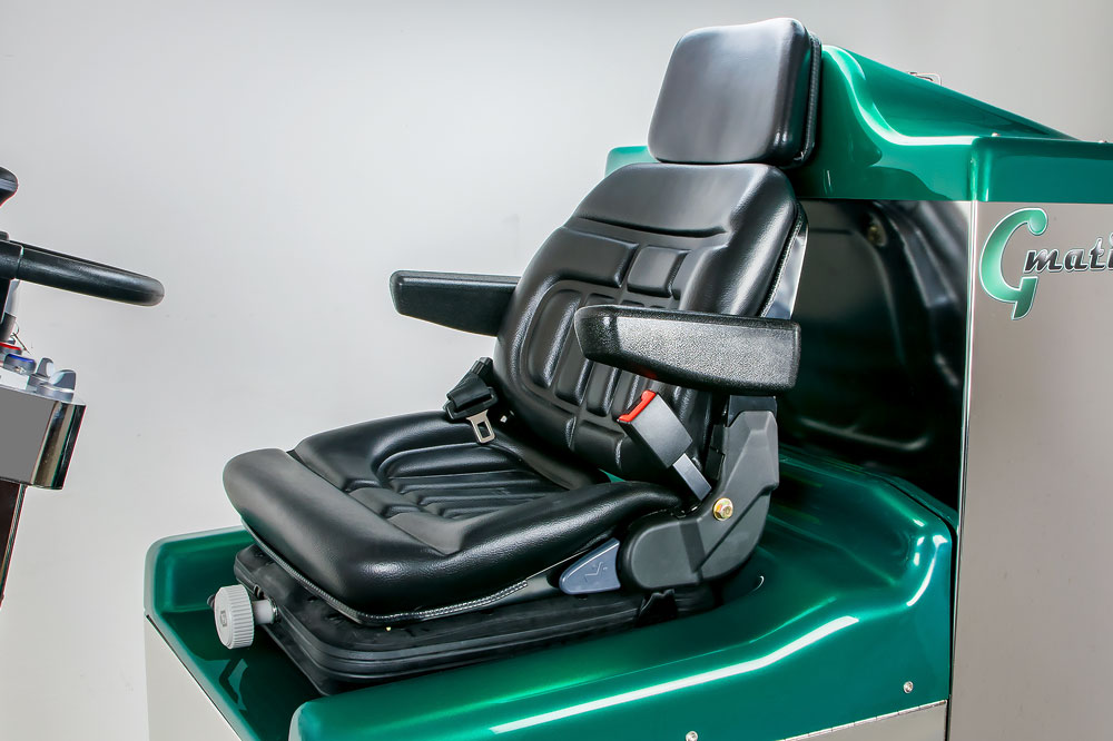 Die serienmäßige Lehnenverlängerung unterstützt den Rücken bis hoch zu den Schulterblättern. Beidseitige Armlehnen, die zum Absteigen vom Sitzplatz nach oben geklappt werden können, entlasten die Schultern und erlauben ein entspannendes Auflegen der Ellbogen während der Reinigungsfahrt. Darüber hinaus erleichtern Armlehnen ein Aufsteigen auf das Fahrzeug und vermitteln während der Reinigungsfahrt, als Begrenzung zu beiden Fahrzeugseiten ein geschlossenes Gefühl von Sicherheit. Auf Grund der hohen Fahrgeschwindigkeit und dem allgemeinen Sicherheitsanspruch der Rotan™-Fahrzeuge ist ein Sicherheitsgurt aus dem KFZ-Bereich serienmäßig Standard